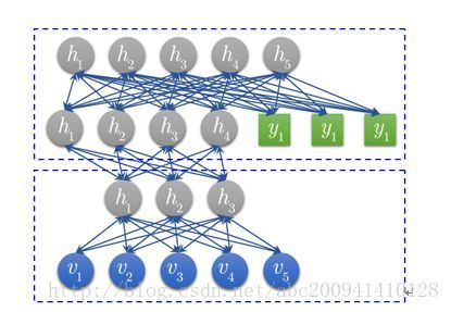 深度信念网络(DBN)由若干层受限玻尔兹曼机(RBM)堆叠而成,上一层RBM的隐层作为下一层RBM的可见层。