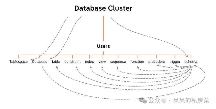 1. Database Cluster:数据库集簇是指一组database,使用的是同一个配置文件并响应公共端口的请求。属于集群的数据库使用一个共同的文件系统位置,存在一套共同的后台进程和内存结构。