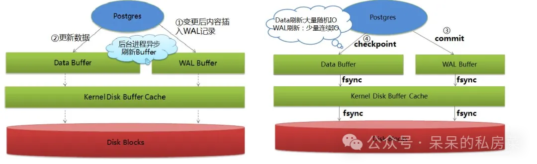 从IO次数来说,wal刷新是少量IO,data 刷新是大量IO,wal刷新次数少得多;