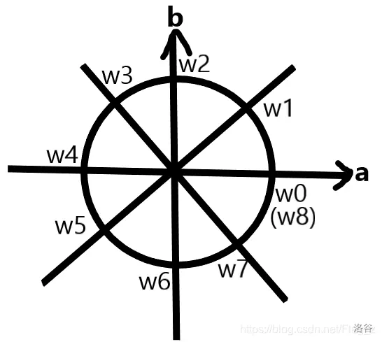 我们如何找单位根呢?这就需要用到复平面了。我们以原点为圆心,画一个半径为 \(1\) 的圆,在满足实部正半轴是其中一条平分线的情况下将整个圆分成 \(n\) 份,每条平分线在圆上的端点所表示的复数,就是一个 \(n\) 次单位根。我们称圆与实部正半轴的交点所表示的复数(其实就是 \(1\))为 \(\omega^0_n\),从 \(\omega^0_n\) 逆时针方向数,依次是 \(\omega^1_n,\omega^2_n,\dots,\omega^{n-1}_n\)。可以结合下面这张图理解(图片来源:https://blog.csdn.net/Flag_z/article/details/99163939)。