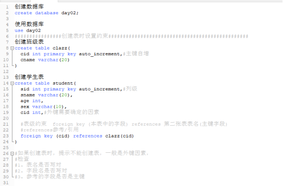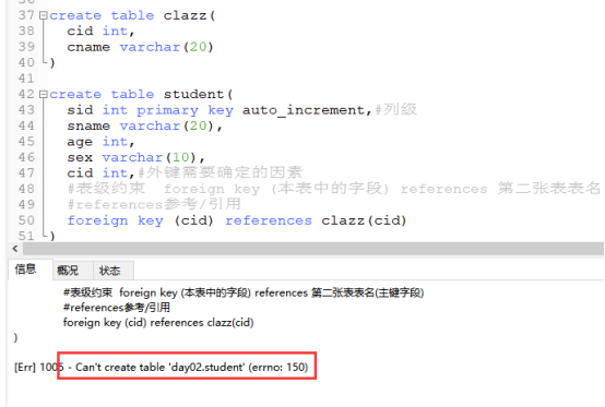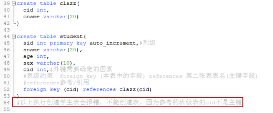 创建失败是因为外键因素,学生表的cid设置为外键,引用班级表中的cid,前提条件是班级表中的cid必须是主键才可以。