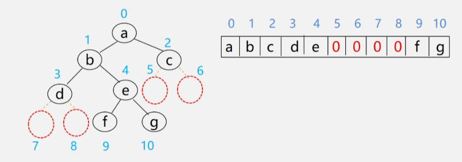 用一个数组来存放二叉树上各结点的数据,需要对二叉树上各个结点进行编号,各个结点的编号等同于该二叉树补全为对应的满二叉树后的编号
