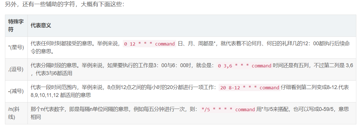 30 3 10,20 * * ls 每月10号及20号的3:30执行ls命令[注:“,”用来连接多个不连续的时段]