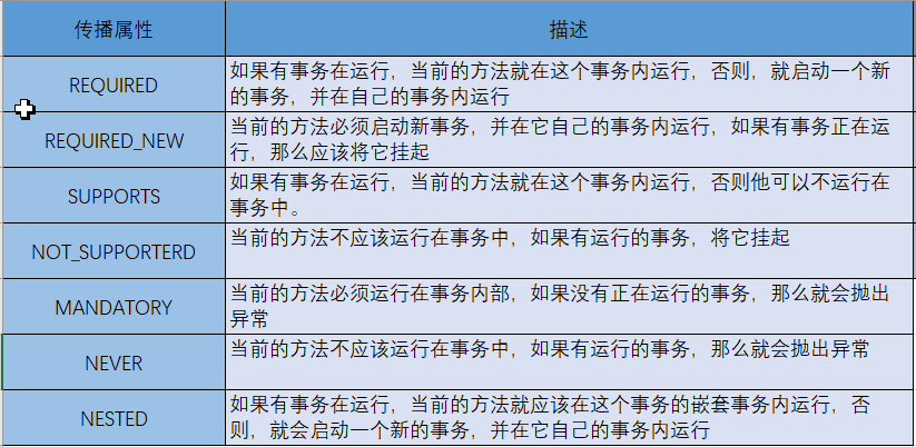 事务的传播新闻可以由传播属性制定。Spring中定义了7中传播行为。