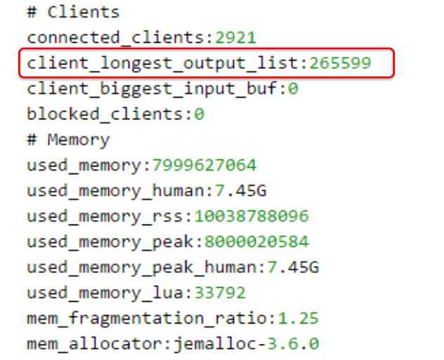 从上面的client_longest_output_list看,应该是输出缓冲区占用内存较大,也就是有大量的数据从Redis服务器向某些客户端输出。