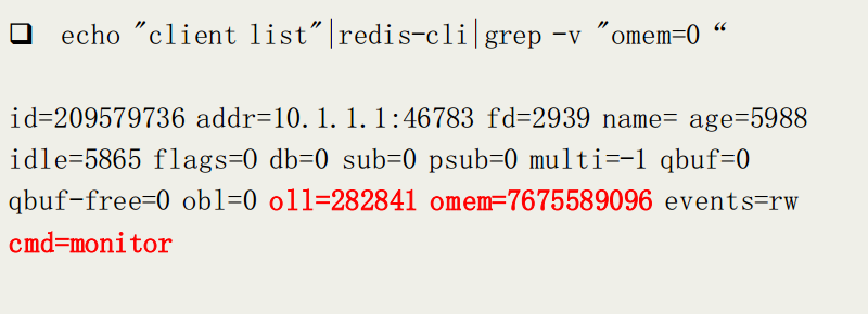 于是使用client list命令(类似于mysql processlist) redis-cli -h host -p port client list | grep -v "omem=0",来查询输出缓冲区不为0的客户端连接,于是查询到祸首monitor,于是豁然开朗.