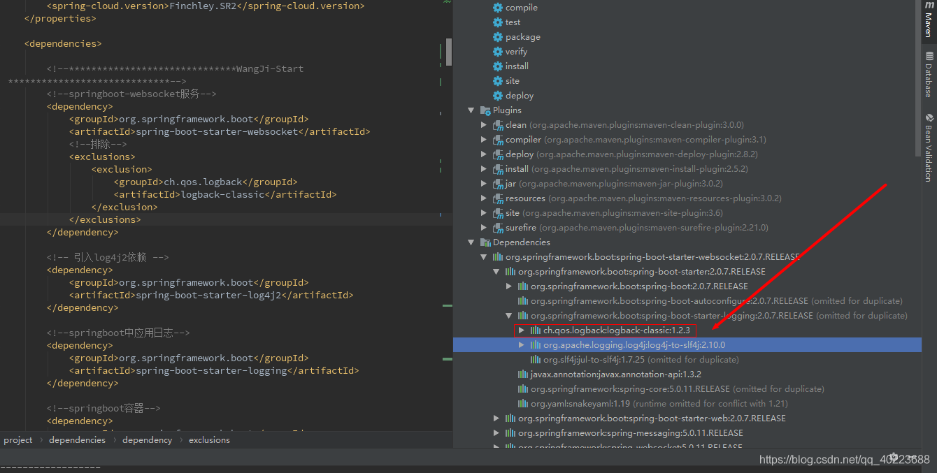 找到哪个依赖引入了logback-classic,然后用依赖排除标签排除掉。