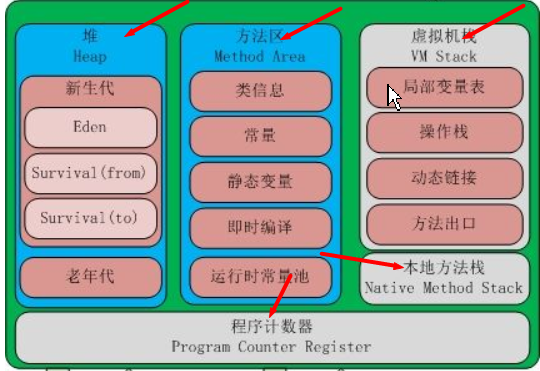 用于存储类结构信息的内存区域,包括常量池、静态变量、构造函数等。虽然JVM规范的把方法区描述成为堆的一个逻辑部分,但是它却有个别名称non-heap(非堆内存区),所以大家对于两者注意区分。方法区还包含一个运行时常量池。