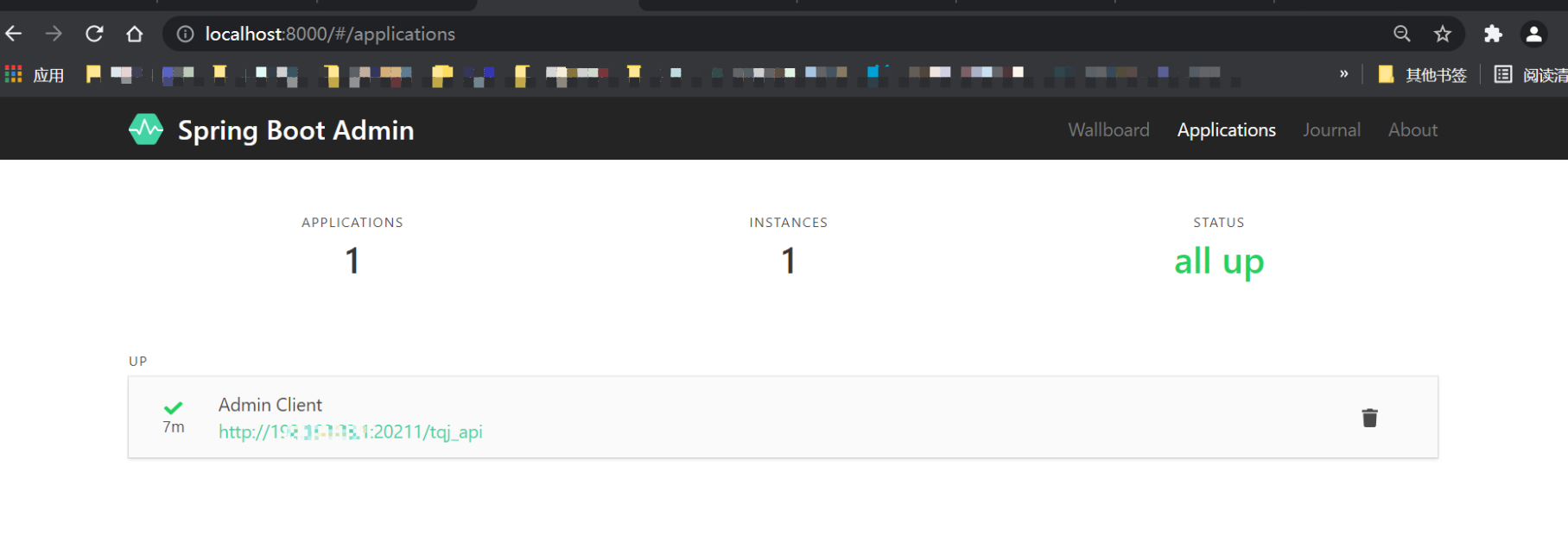 # 配置访问端口 server: port: 20211 spring: application: name: Admin Client # 配置AdminServer的地址 boot: admin: client: url: http://localhost:8000 # 打开客户端的监控 management: endpoints: web: exposure: include: * -