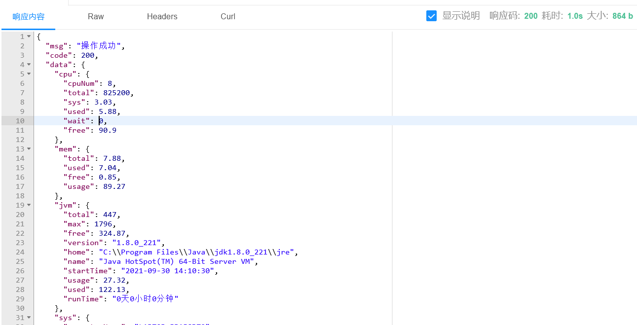 package com.lzby.tqj.entity.server; import java.lang.management.ManagementFactory; import com.lzby.tqj.common.util.Arith; import com.lzby.tqj.common.util.DateUtils; /** * JVM相关信息 **/ public class Jvm{ // 当前JVM占用的内存总数(M) private double total; // JVM最大可用内存总数(M) private double max; // JVM空闲内存(M) private double free; // JDK版本 private String version; // JDK路径 private String home; public double getTotal(){ return Arith.div(total, (1024 * 1024), 2); } public void setTotal(double total){ this.total = total; } public double getMax(){ return Arith.div(max, (1024 * 1024), 2); } public void setMax(double max){ this.max = max; } public double getFree(){ return Arith.div(free, (1024 * 1024), 2); } public void setFree(double free){ this.free = free; } public double getUsed(){ return Arith.div(total - free, (1024 * 1024), 2); } public double getUsage(){ return Arith.mul(Arith.div(total - free, total, 4), 100); } // 获取JDK名称 public String getName(){ return ManagementFactory.getRuntimeMXBean().getVmName(); } public String getVersion(){ return version; } public void setVersion(String version){ this.version = version; } public String getHome(){ return home; } public void setHome(String home){ this.home = home; } // JDK启动时间 public String getStartTime(){ return DateUtils.parseDateToStr(DateUtils.YYYY_MM_DD_HH_MM_SS, DateUtils.getServerStartDate()); } // JDK运行时间 public String getRunTime() { return DateUtils.getDatePoor(DateUtils.getNowDate(), DateUtils.getServerStartDate()); } } -