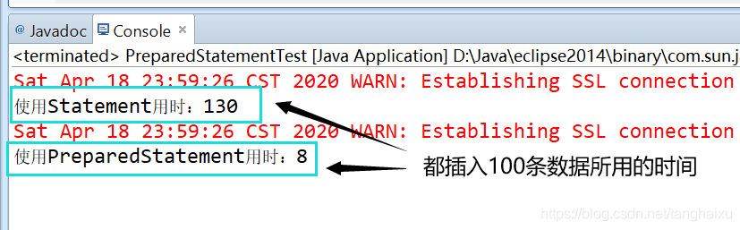 分别用PreparedStatement和Statement插入100条数据,结果如下: