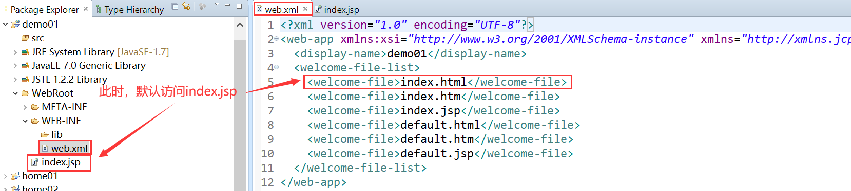 所以,如果想让浏览器访问我们指定的网页,更改web.xml 配置文件里面的