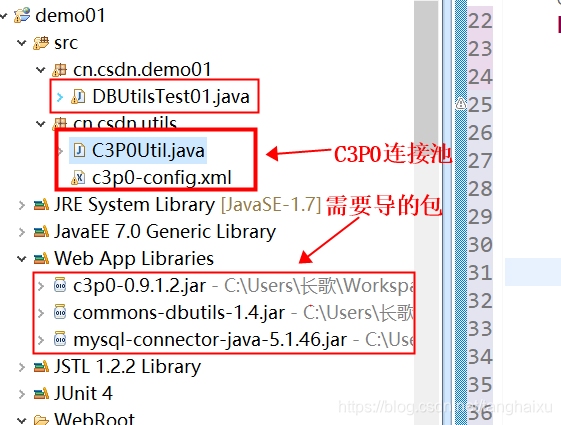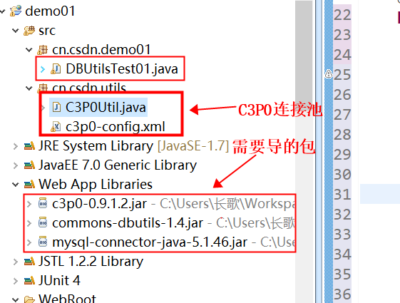- 导入 jar 包,用到MySQL数据库、C3P0、DBUtils,至少导入这三个 jar 包