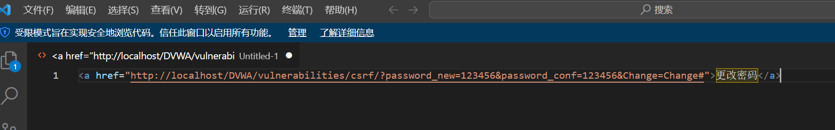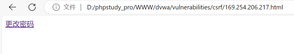 构造一个页面,里面放一个a标签,链接为更改密码的url,当受害者点击时就会触发更改密码的操作,我们只需要把这个html页面的位置放在和网站同一个目录下,即在自己的电脑上构造一个访问目标网站域名的html文件