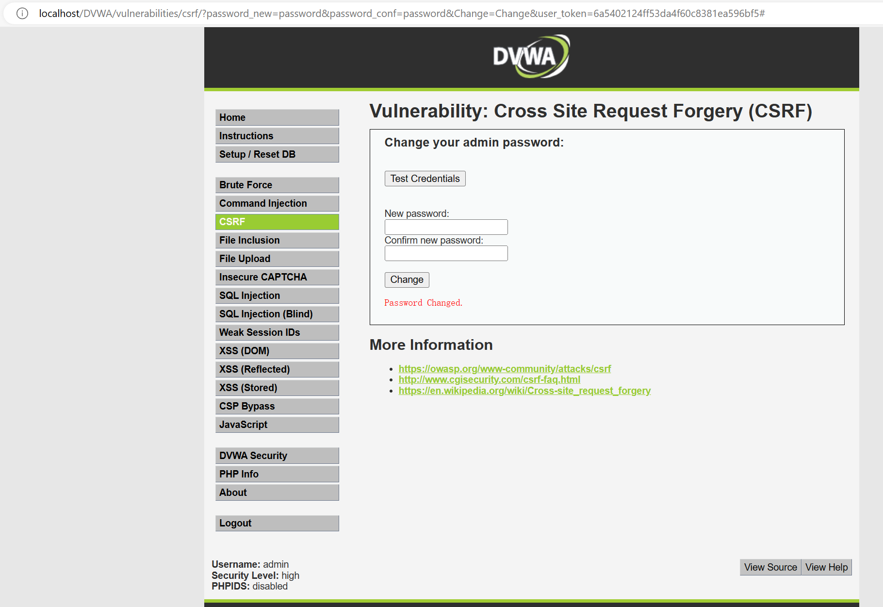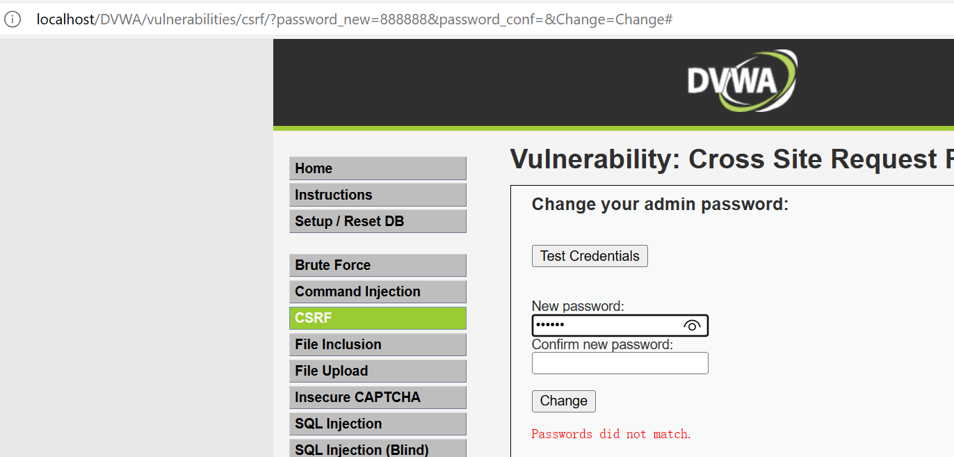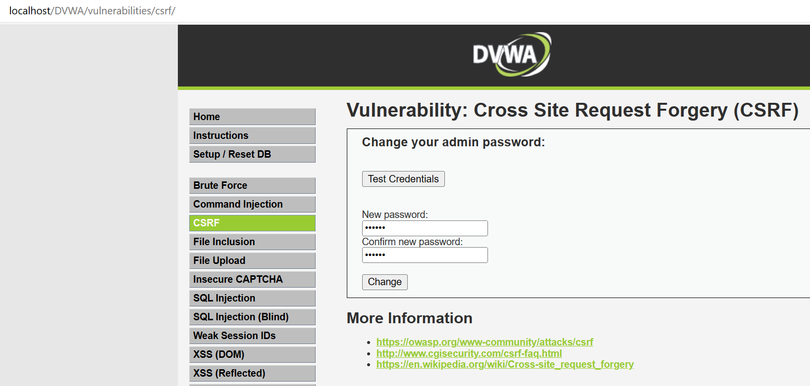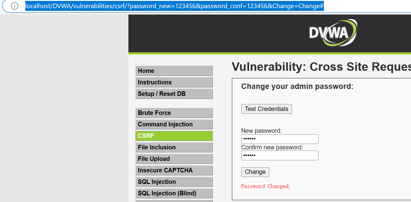 http://localhost/DVWA/vulnerabilities/csrf/?password_new=123456&password_conf=123456&Change=Change#
