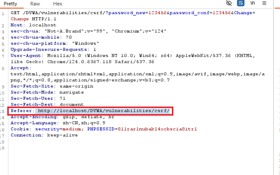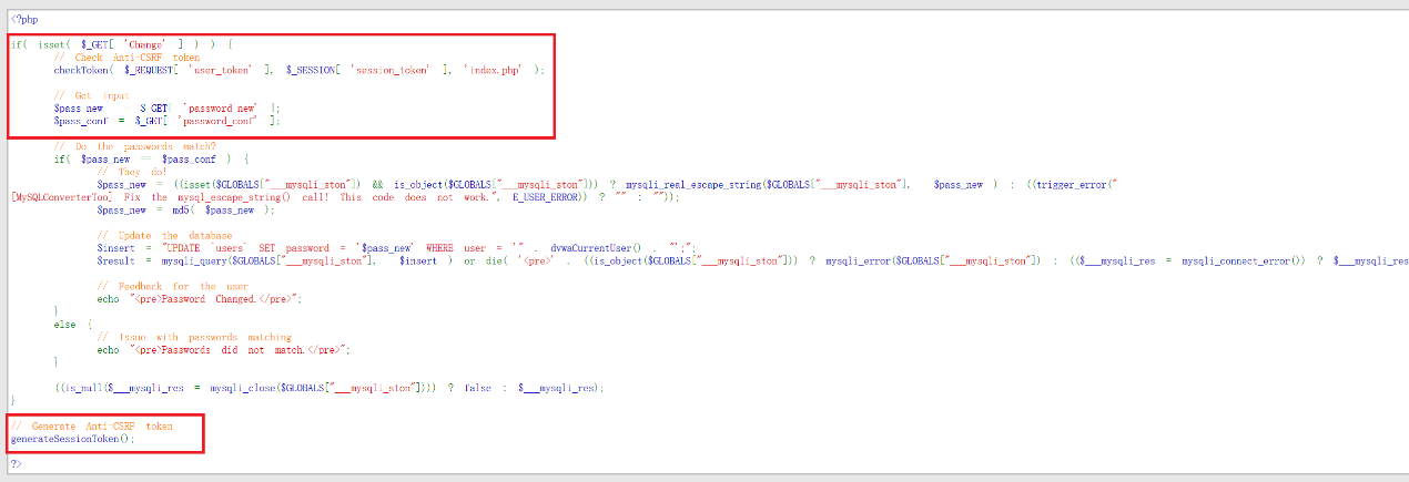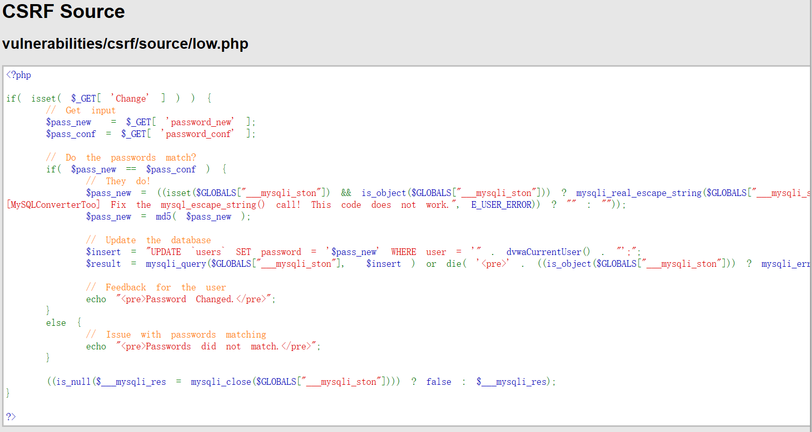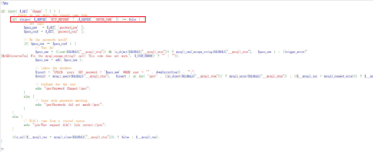 源码分析:和Low等级比较发现,只有一处改变,即在传入密码和确认密码参数前先进行了一个if语句的判断,判断里面的内容主要是验证这个访问请求是否是从dwva网站本身发起的,若不是就不执行后面的操作