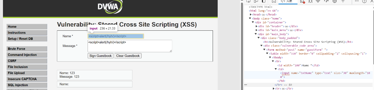 然后在回到检查页面输入<script>alert(/hyh/)</script>