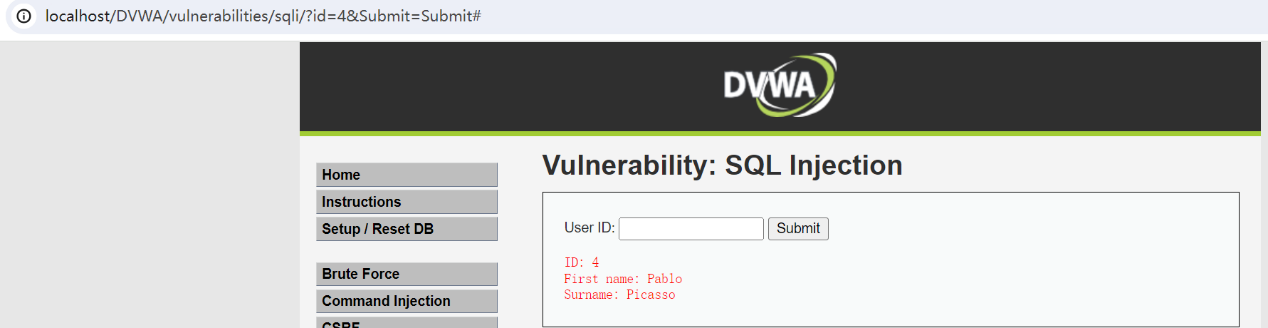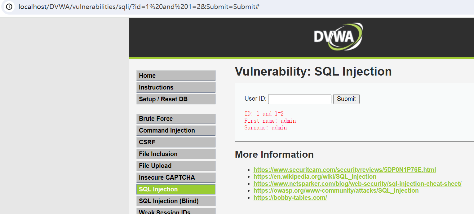 http://127.0.0.1/dvwa/vulnerabilities/sqli/?id=1 and 1=2 &Submit=Submit#