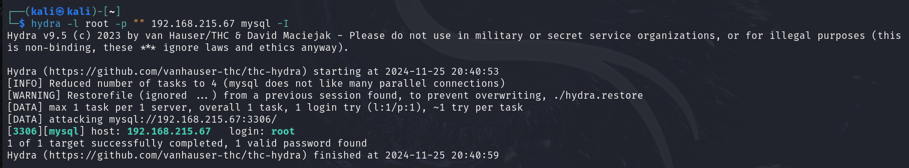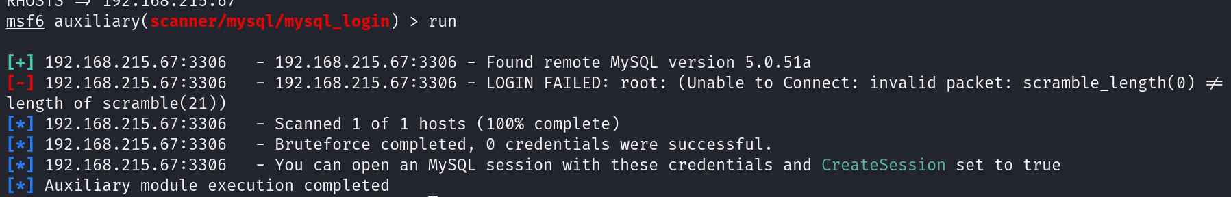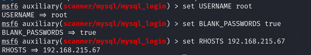 msf6 auxiliary(scanner/mysql/mysql_login) > set RHOSTS 192.168.215.67