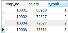 select emp_no, salary, dense_rank() over(order by salary desc) as t_rank from salaries