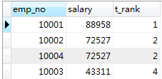 需要对salary进行1-N排名,需要用到rank() ovre(业务逻辑)函数,但又因有相同薪水的员工,这样在相同排名的下一位员工只需要在之前相同排名的基础上+1即可,故要用到dense_rank() over(业务逻辑)函数