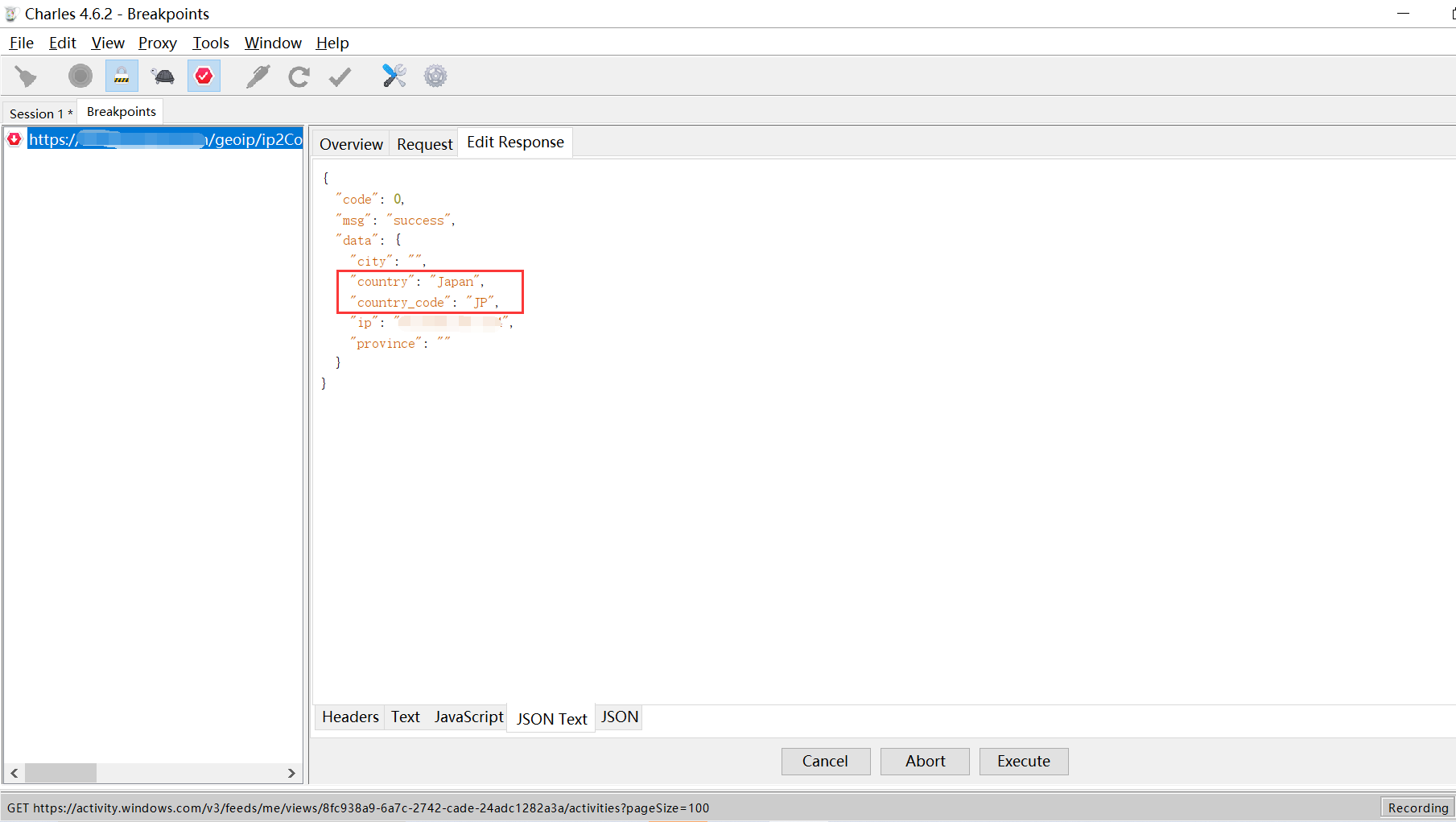 6.点击完Execute后,会跳转到exit response的界面,可以在这里修改为我想要的数据,这里我把数据设置为日本,再点击Execute