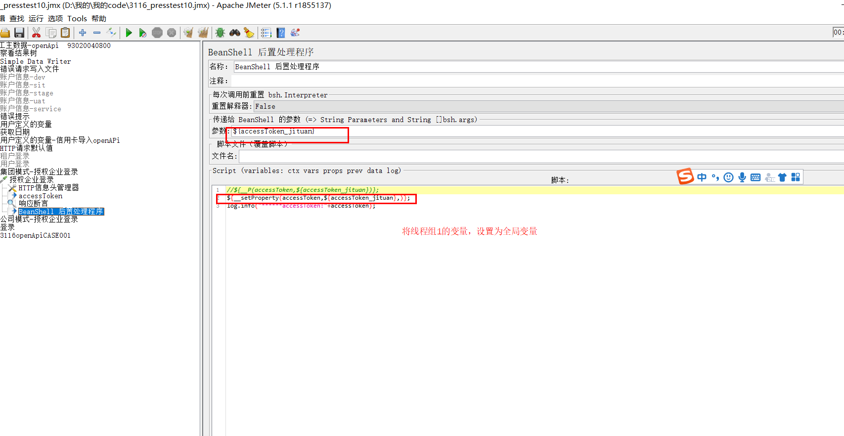 使用beanshell 将线程组1的变量设为全局变量