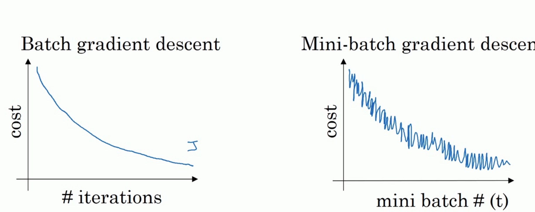 如上图,左边是full batch的梯度下降效果。 可以看到每一次迭代成本函数都呈现下降趋势,这是好的现象,说明我们w和b的设定一直再减少误差。 这样一直迭代下去我们就可以找到最优解。 右边是mini batch的梯度下降效果,可以看到它是上下波动的,成本函数的值有时高有时低,但总体还是呈现下降的趋势。 这个也是正常的,因为我们每一次梯度下降都是在min batch上跑的而不是在整个数据集上。 数据的差异可能会导致这样的效果(可能某段数据效果特别好,某段数据效果不好)。但没关系,因为他整体的是呈下降趋势的。