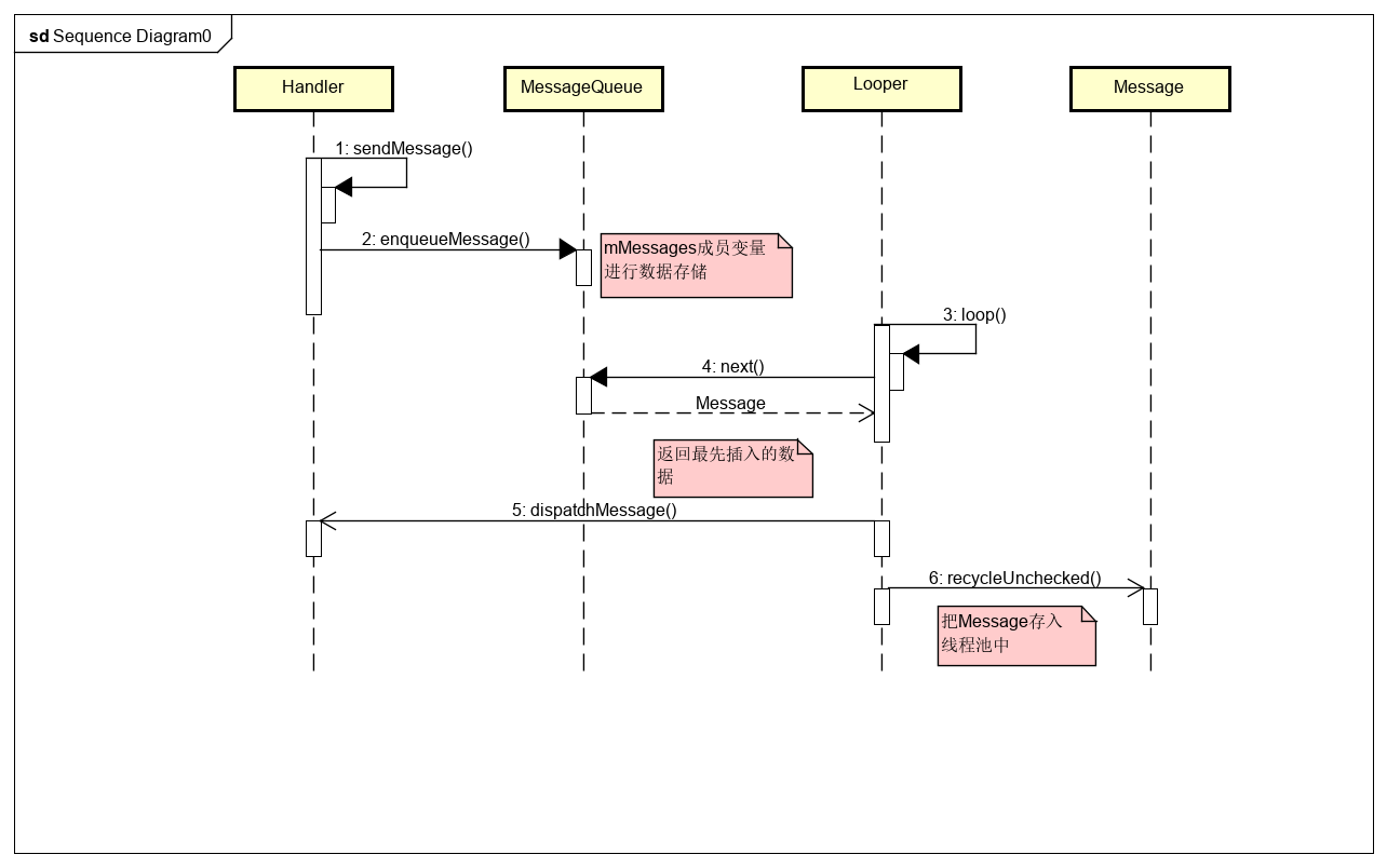 这仅仅是一个message调用recycleUnchecked发生的情况,如果有很多个sendmessage都发送,recycleUnchecked就会被多次调用,那么就会形成第一张图的message缓存池