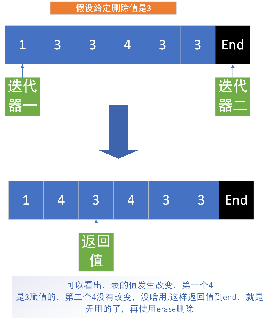 这就是remove的核心,的确不能直接删除元素,但是remove对整个迭代器区间的元素进行了重新赋值分配,划分了两拨,前面是不含有给定值的,后面是含有给定值的来个图片