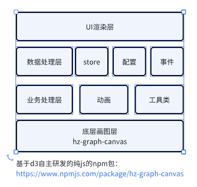 基于canvas的画图,可以选择阿里巴巴的G6,使用它提供的api进行画图,这种方案适合小公司小团队;如果公司规模和团队还不小,可以基于d3自己封装画图的能力,可以参考G6或者国外的一些开源项目,这样子在性能和功能上都做到的自主可控,我当时在的公司和团队还不错,所以选择自己来搞,基于d3自己分装的画图底层库,地址是:https://www.npmjs.com/package/hz-graph-canvas,分层架构: