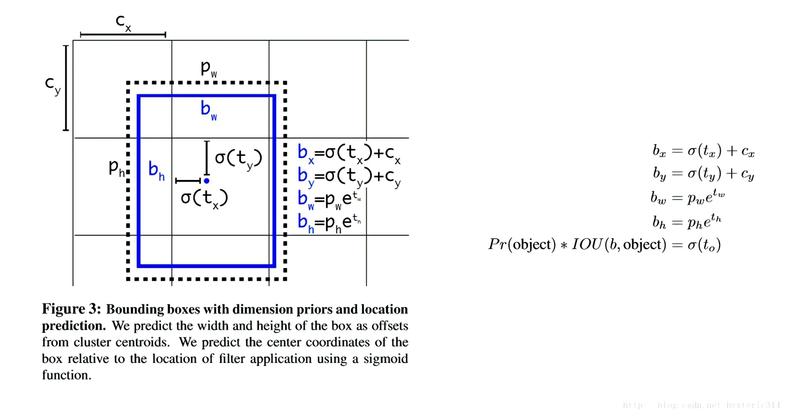 - 按照之前YOLOv1的方法,网络不会预测偏移量,而是根据YOLOv1中的网格单元的位置来直接预测坐标,这就让Ground Truth的值介于0到1之间。而为了让网络的结果能落在这一范围内,网络使用一个 Logistic Activation来对于网络预测结果进行限制,让结果介于0到1之间。 网络在每一个网格单元中预测出5个Bounding Boxes,每个Bounding Boxes有五个坐标值tx,ty,tw,th,t0,他们的关系见下图。假设一个网格单元对于图片左上角的偏移量是cx,cy,Bounding Boxes Prior的宽度和高度是pw,ph,那么预测的结果见下图右面的公式: