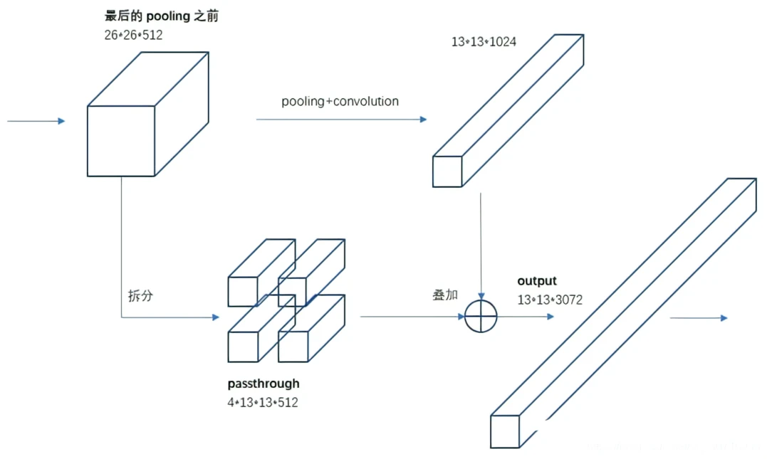 - YOLOv2引入一种称为passthrough层的方法在特征图中保留一些细节信息。具体来说,就是在最后一个pooling之前,特征图的大小是2626512,将其1拆4,直接传递(passthrough)到pooling后(并且又经过一组卷积)的特征图,两者叠加到一起作为输出的特征图。