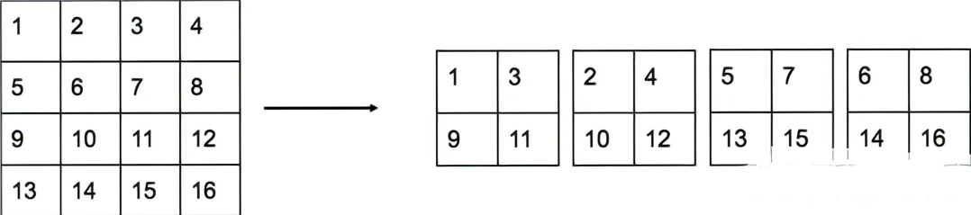 具体怎样将1个特征图拆成4个特征图,见下图,图中示例的是1个44拆成4个22,因为深度不变,所以没有画出来。