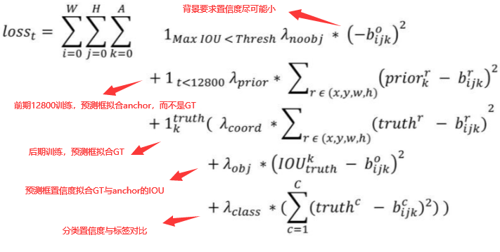 - 第二项是计算先验框与预测宽的坐标误差,但是只在前12800个iterations间计算,我觉得这项应该是在训练前期使预测框快速学习到先验框的形