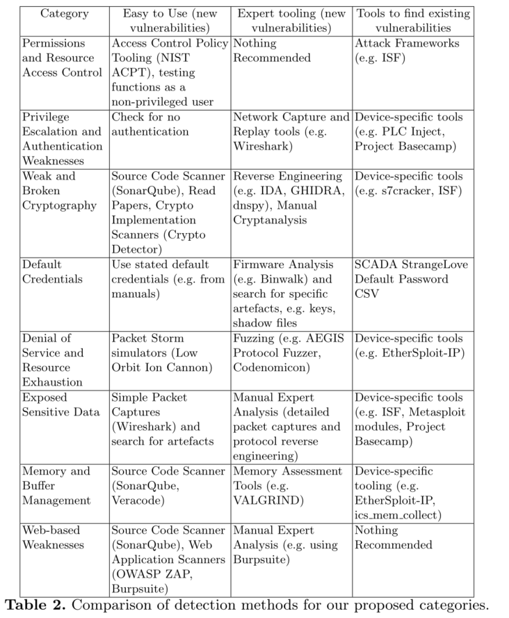 基于具体的检测方法,我们提出了八类漏洞。这些类别涵盖了我们数据集中所有漏洞的95%,并为ICS所有者提供了他们可以遵循的明确步骤,以发现弱点,并就优先解决的领域向供应商提供建议。