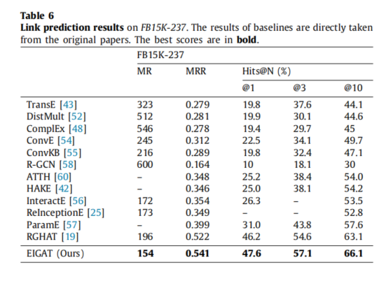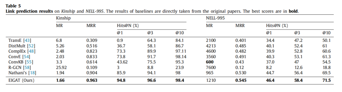 - 与NELL-995的基线相比,EIGAT的优势似乎比其他的要小。这是因为相对密集图中丰富的全局结构信息,即FB15和K-237,与相对稀疏图中较少的全局结构知识,即相对稀疏图相比,全局随机游走方法可以更有效地估计实体的重要性。