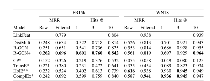 LinkFeat、DistMult、CP、TransE、ComplEx、HolE