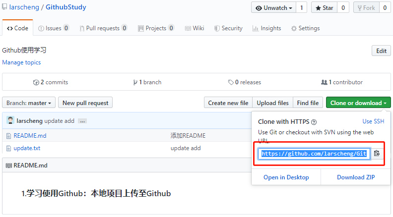 注意:这里的项目仓库地址是你在github创建完新仓库时自动生成的,比如我刚刚创建后生成的是:https://github.com/larscheng/GithubStudy.git
