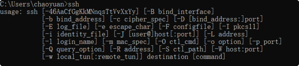 OpenSSH安装成功后,Win+R输入cmd进入终端,输入ssh命令应该得到如下结果: