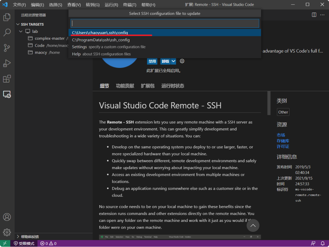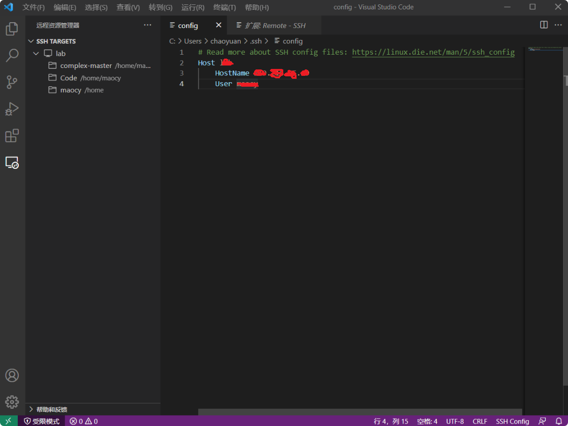 安装完Remote-SSH以后左侧会出现一个远程资源管理的图标,选择SSH Targets,进入config配置文件
