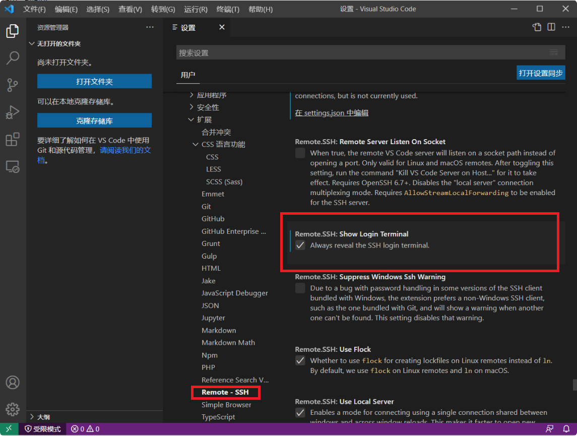 更改设置,File->Preferences->Settings->Extension->Remote-SSH,找到Show Login Terminal并勾选。