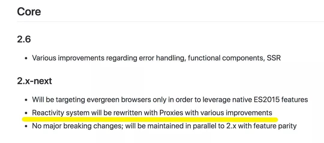 如果你一直有关注Vue的发展,就会发现2.x-next版本开始其响应式引擎将使用Proxy重写,这就与我们之前讲的不同了。