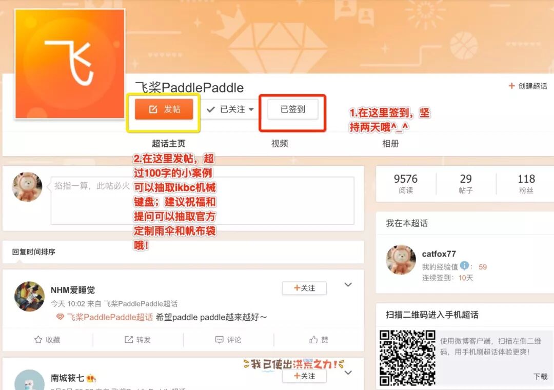 在微博超话「飞桨PaddlePaddle」坚持打卡两天,在其中一条发布PaddlePaddle小案例,超过100字就可以参与机械键盘抽奖活动!