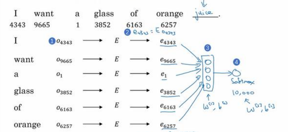 关于嵌入向量是以某个词为例(建立one-hot向量来表示这个单词)左乘一个参数矩阵E,得到嵌入向量。具体如下图所示。