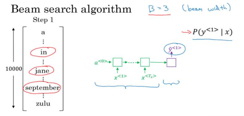 集束算法搜索会考虑多个选择,这个选择的多少取决于搜索算法的一个参数B(集束宽)。比如在这个例子中,集束宽度为3,因此一次会考虑3个,在下次查找中选出最大可能性的单词。这种搜索方式最终会终止在句尾符号上,然后输出最有可能输出的一个句子。