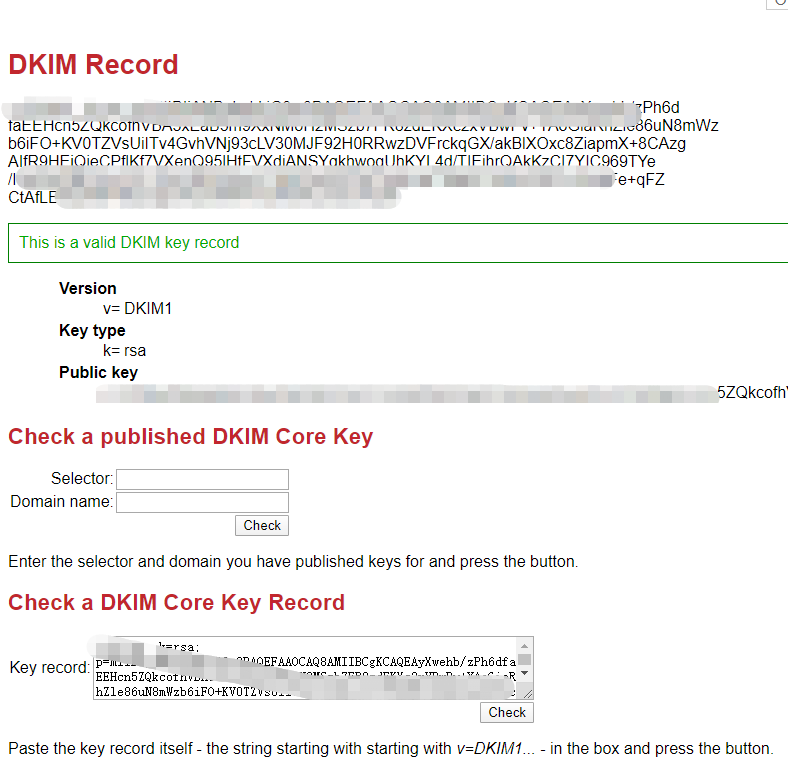 访问https://dkimcore.org/c/keycheck输入域名和selector验证DKIM是否生效