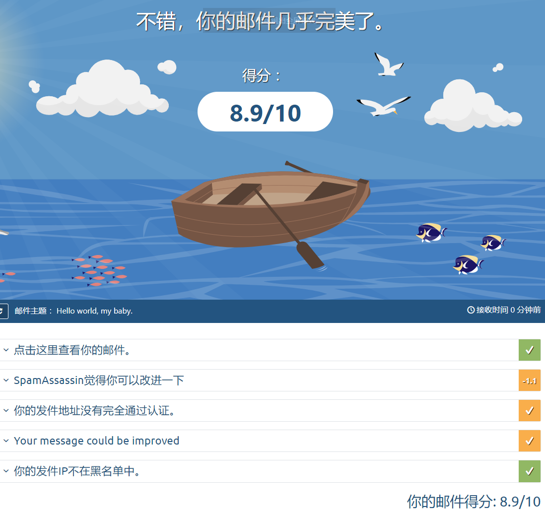 7. 访问https://www.mail-tester.com/并向生成的邮箱发送邮件,然后查看分数