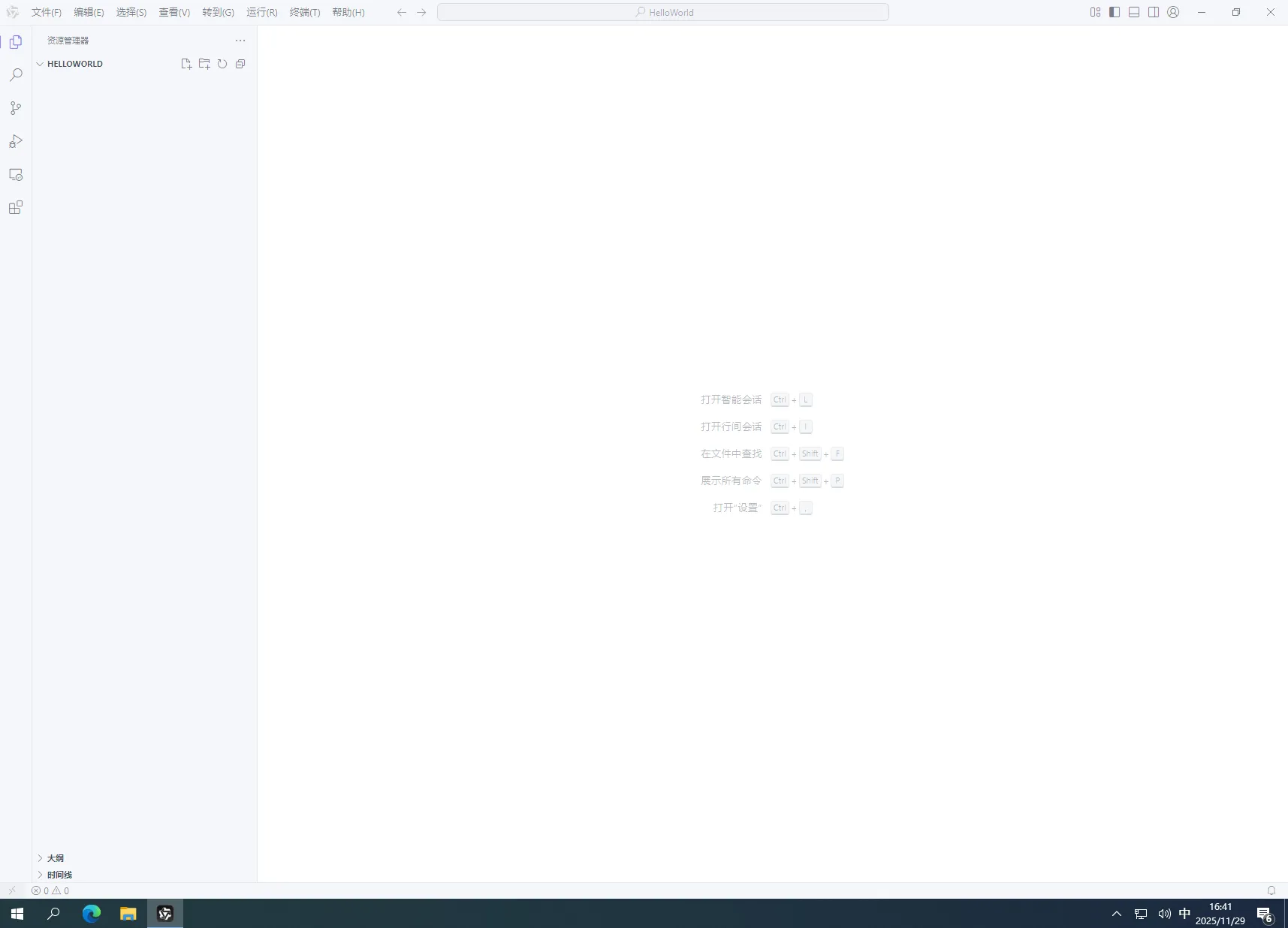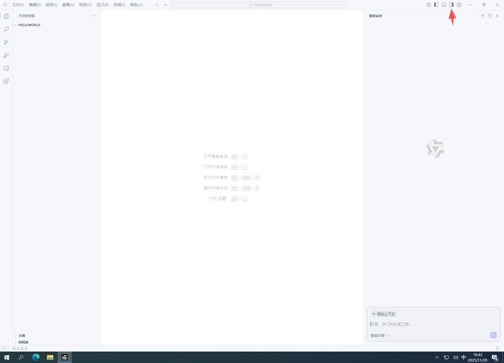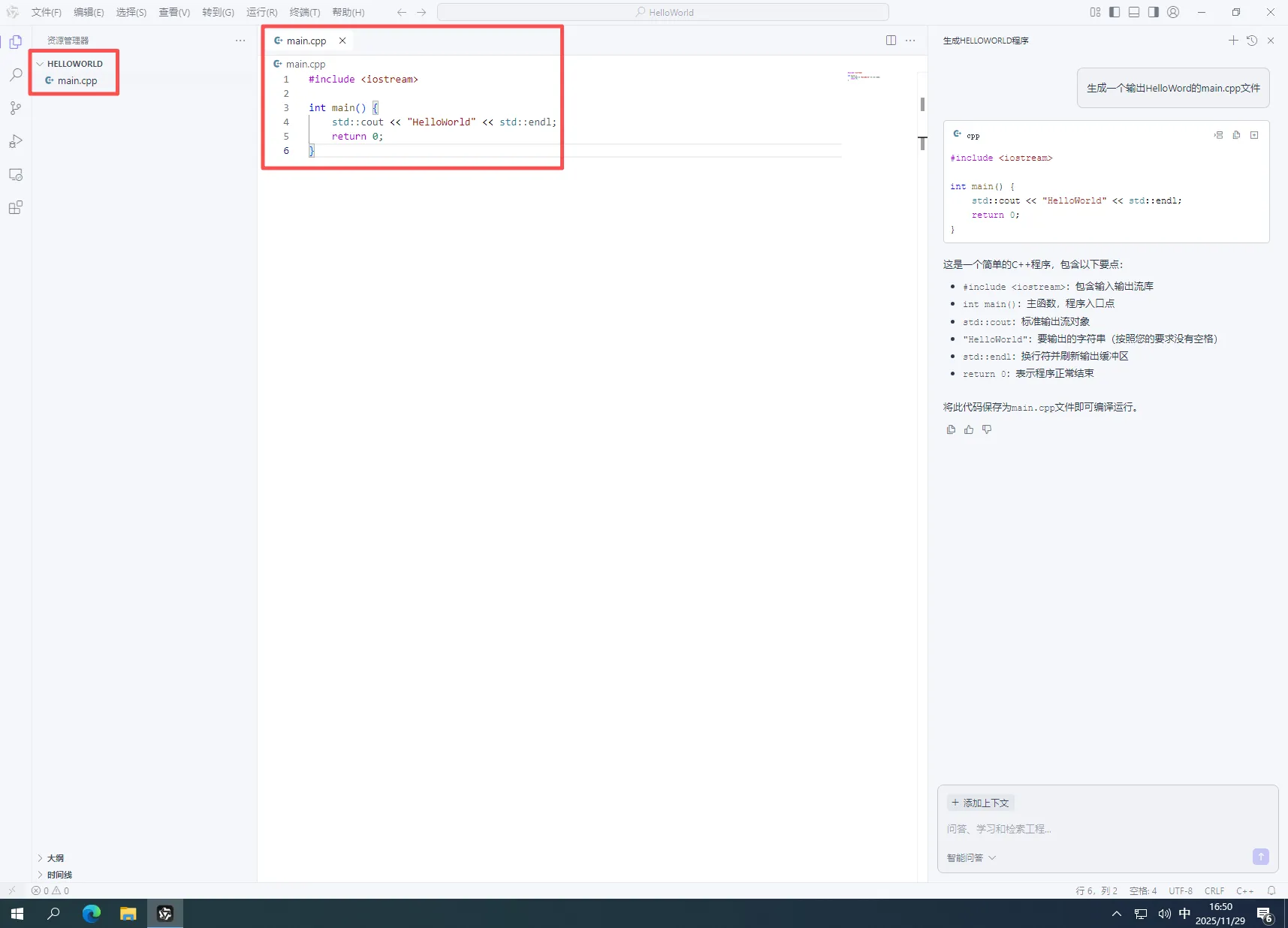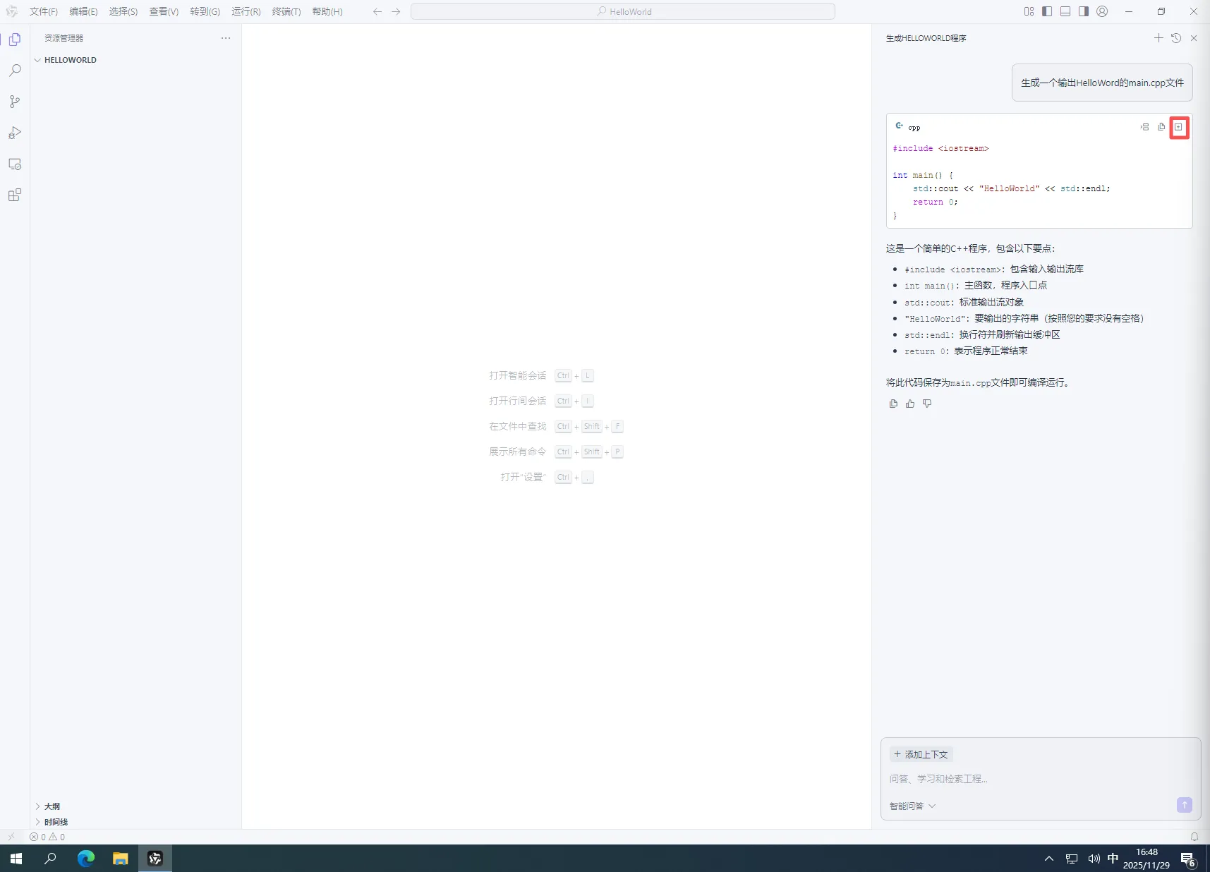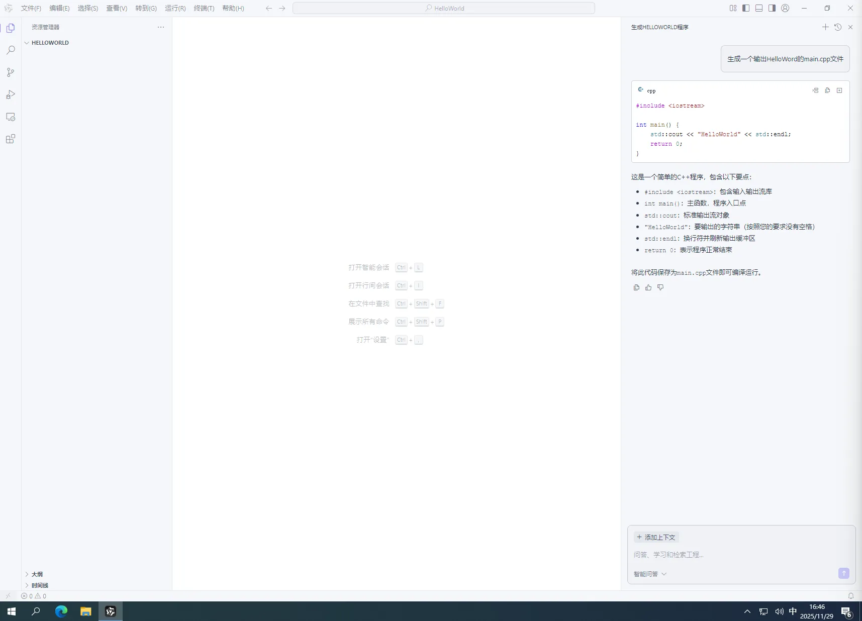 4.在弹出的AI对话框中,输入“生成一个输出HelloWord的main.cpp文件”然后回车,如下图所示: